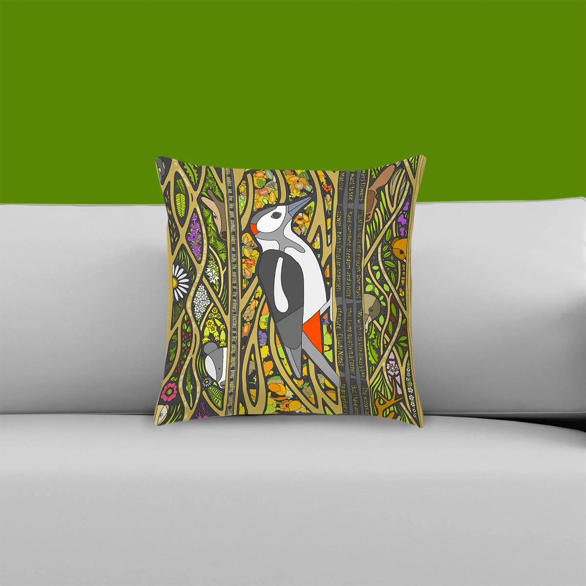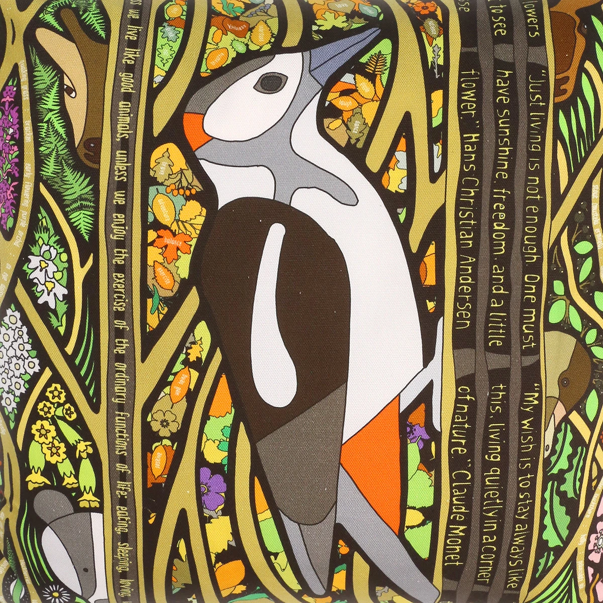 The hedgerows’ branches weave together various aspects of British woodland and hedgerow with our life’s journey. The central panel features a path winding towards a hill’s summit, a metaphor for the positive role of the countryside in helping us climb out of entanglement with a sense of liberation.