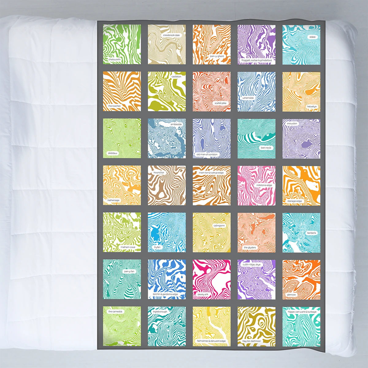 Title: Contour Range – 35 Treasured Places – Fleece Blanket on GREY or WHITE.