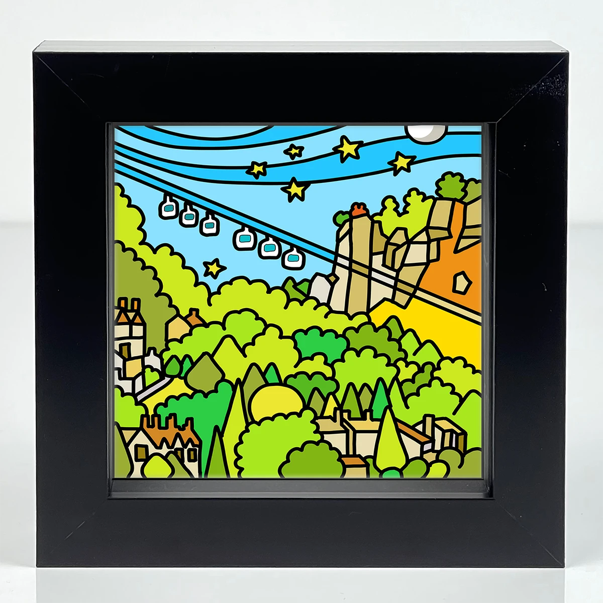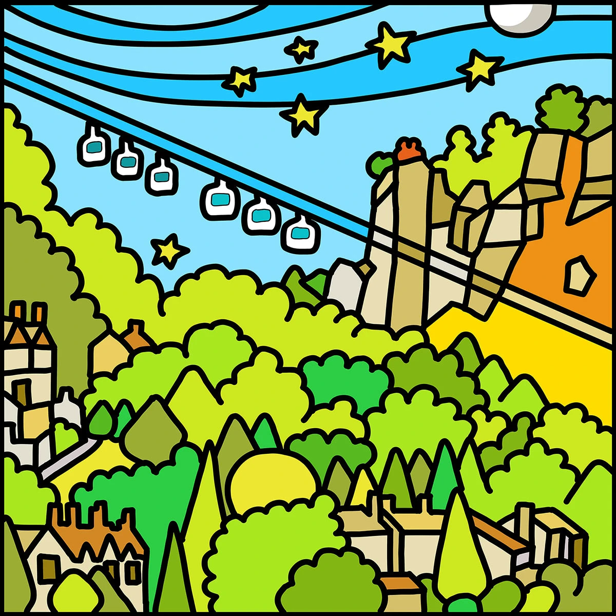 Featuring the pioneering cable car system that carries visitors too and from the Heights of Abraham, a major tourist visitor attraction in the Peak District. Overlooking Matlock and the surrounding cliffs.