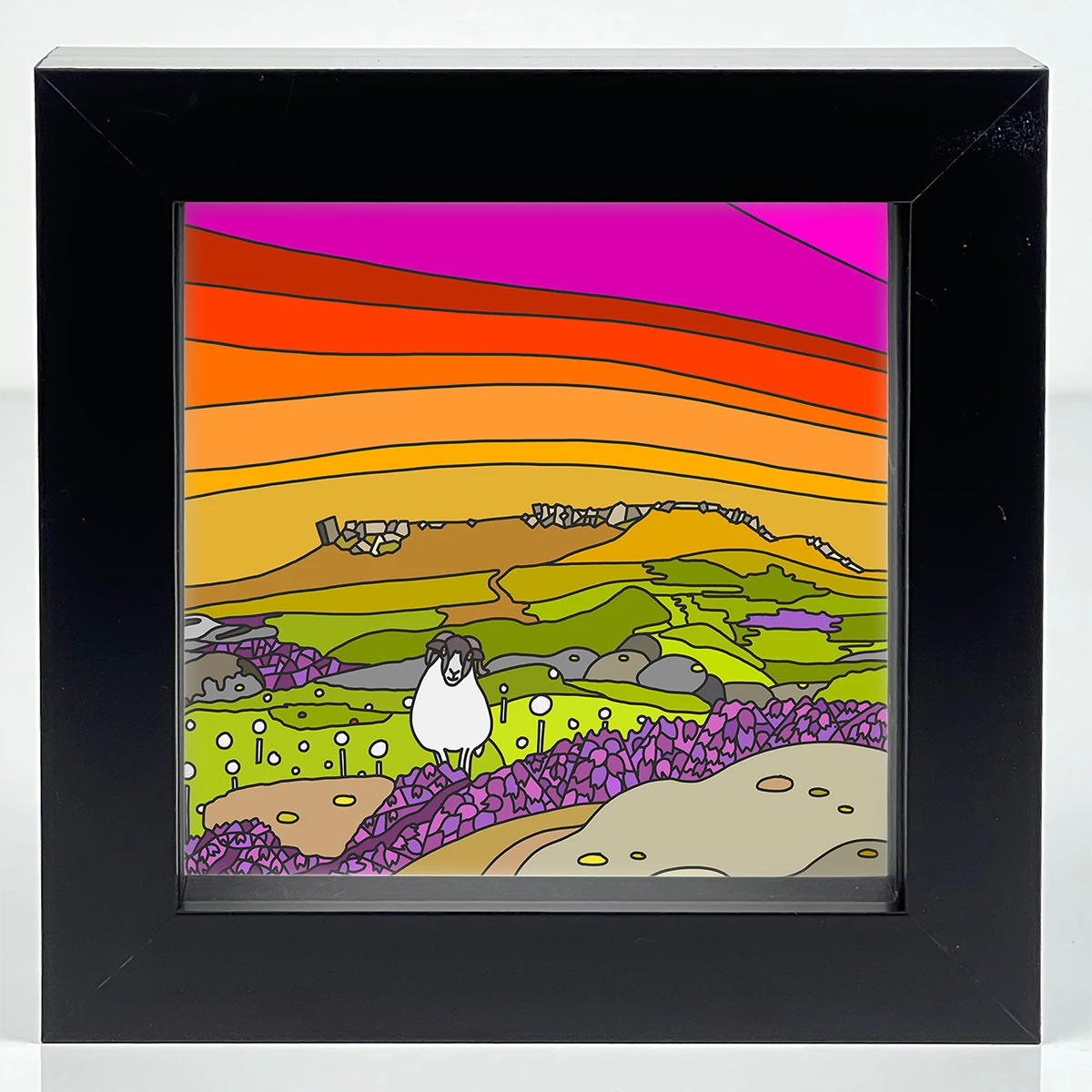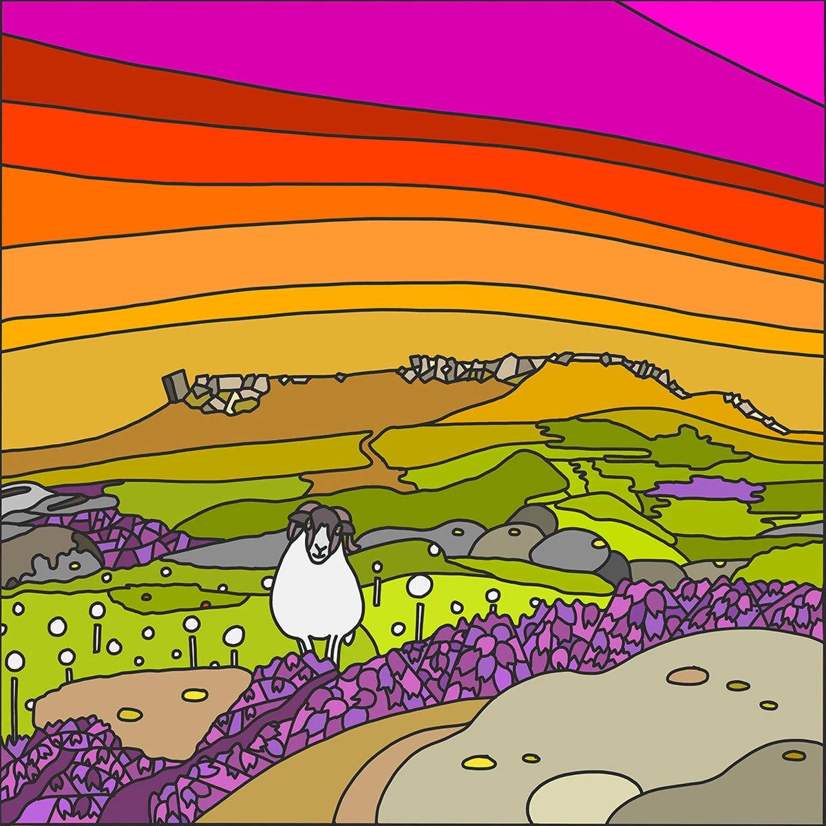 This pen drawing features the moorland heather, black faced sheep, the distinctive leaning block of the Higgar Tor crag, favoured by local climbers and the annual spectacle that is the cotton grass (bog cotton) around the Peak District.