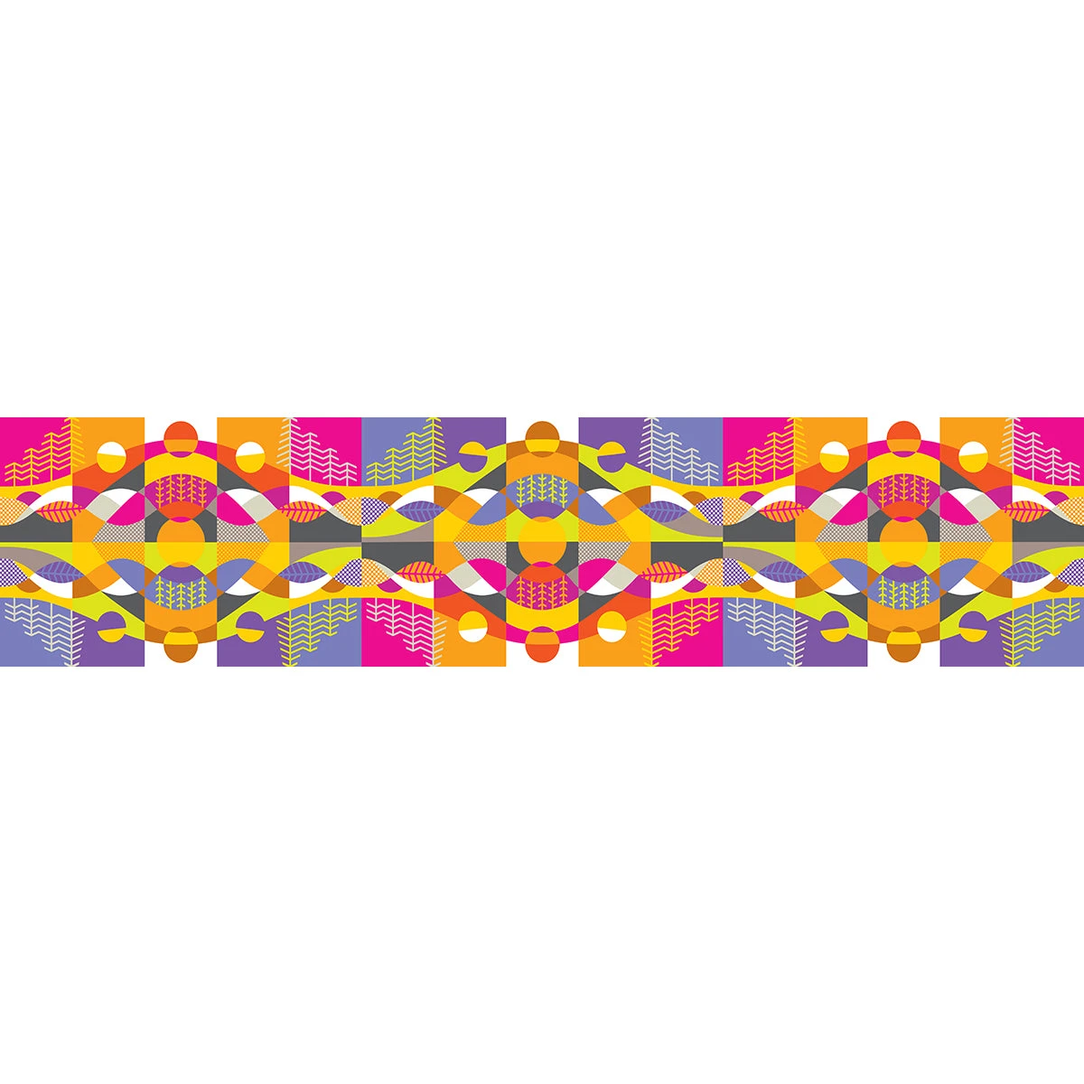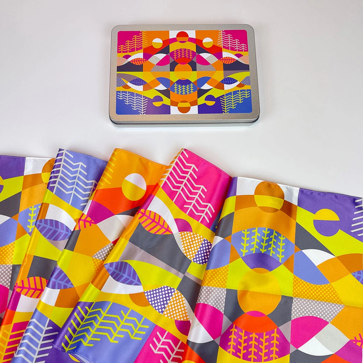 The flowing shapes of the work contrast with the broken choices of colours, over the ranges of mountain and hill tops, as the cycles of the sun rise and set. The highly stylised pattern includes trees, leaves and rock, perfectly reflected below, more hills and lakes, complete a very personal and brightly coloured view of this much loved National Park.