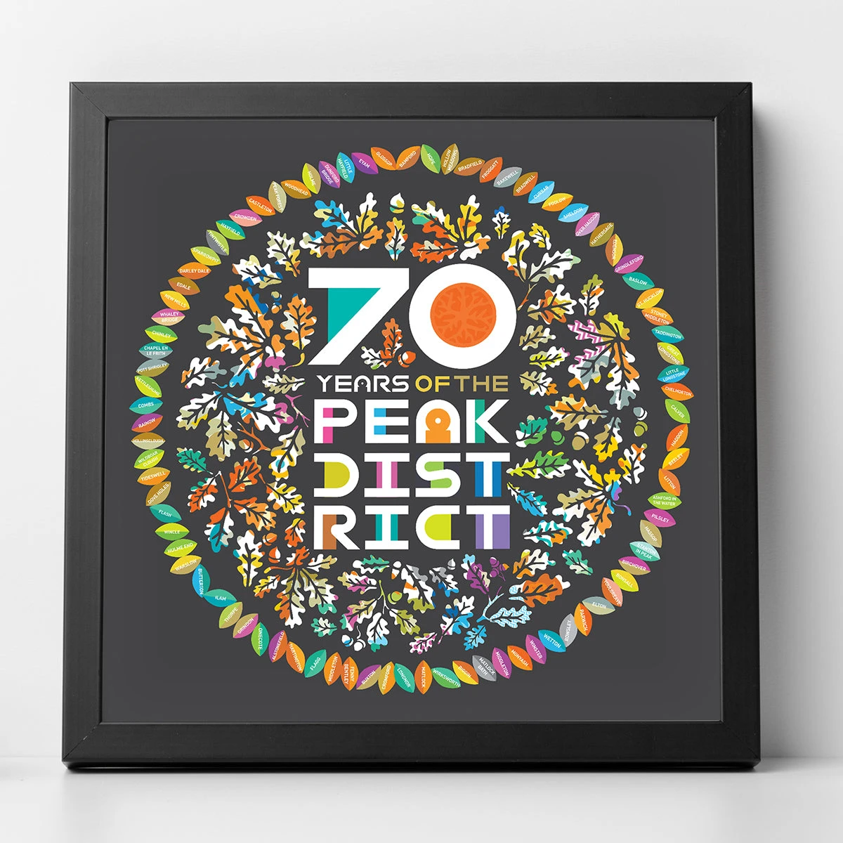 The central area comprises an oak leaf pattern and the logo motif for the 70 years of the Peak District celebration. The oak leaves are filled with the pattern of experiences. Created by Si this April to celebrate the Park and to help raise funds for the Peak District National Park Foundation.