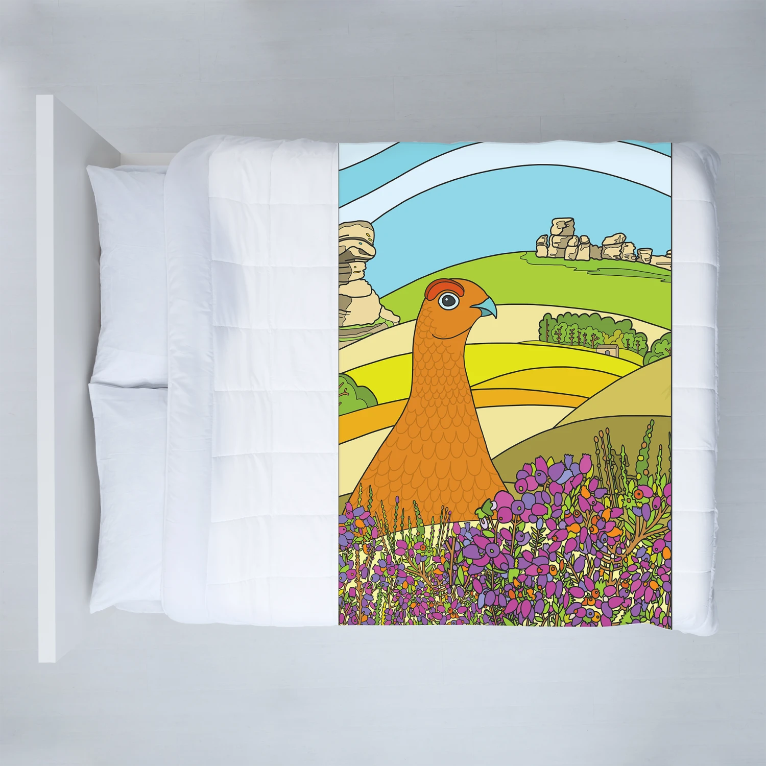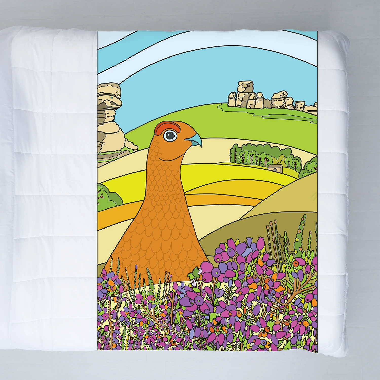 This work highlights some of the major features of the southern end of Derwent Edge in the Peak District. A Red Grouse and stylised Heather in the foreground conceal two moorland fell runners. The skyline includes the Pepper Pot and the Coach and Horses from this postcard picture of a gritstone edge.