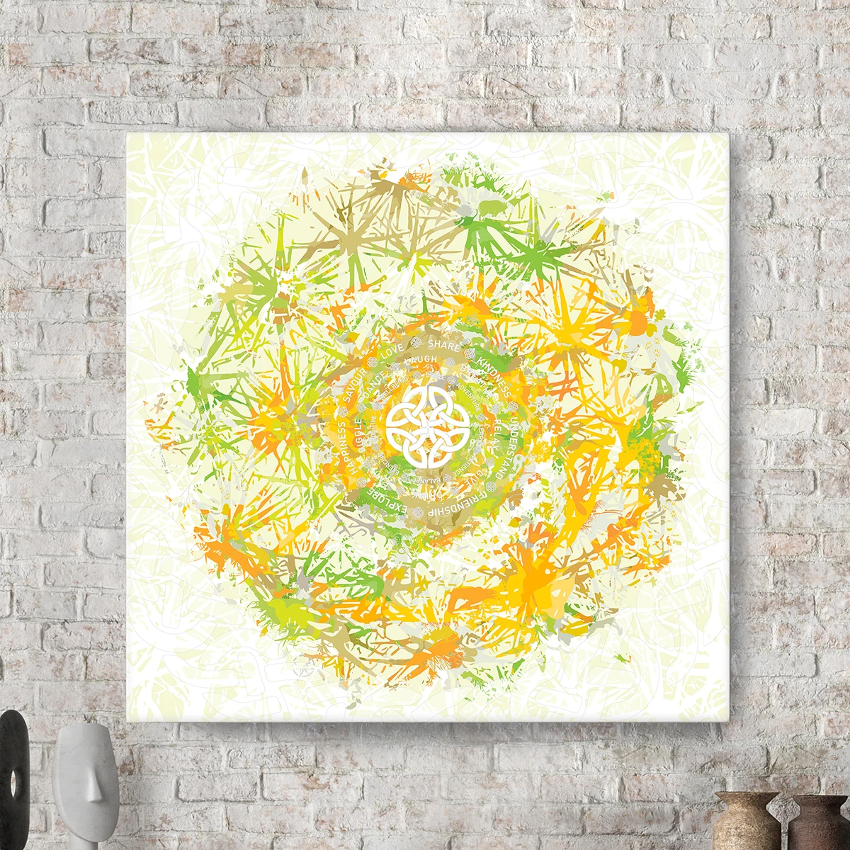 This work is a celebration of the cycles of nature and its inextricably connectedness to all our lives. Purposefully radiating sunshine, the natural world is shown as a series of colourful rings of our British countryside fused into the starburst pattern of vital sphagnum moss. Then seated at the core of the work are the three rings of wellbeing, woven into and working with the central eternal knot of our central being.