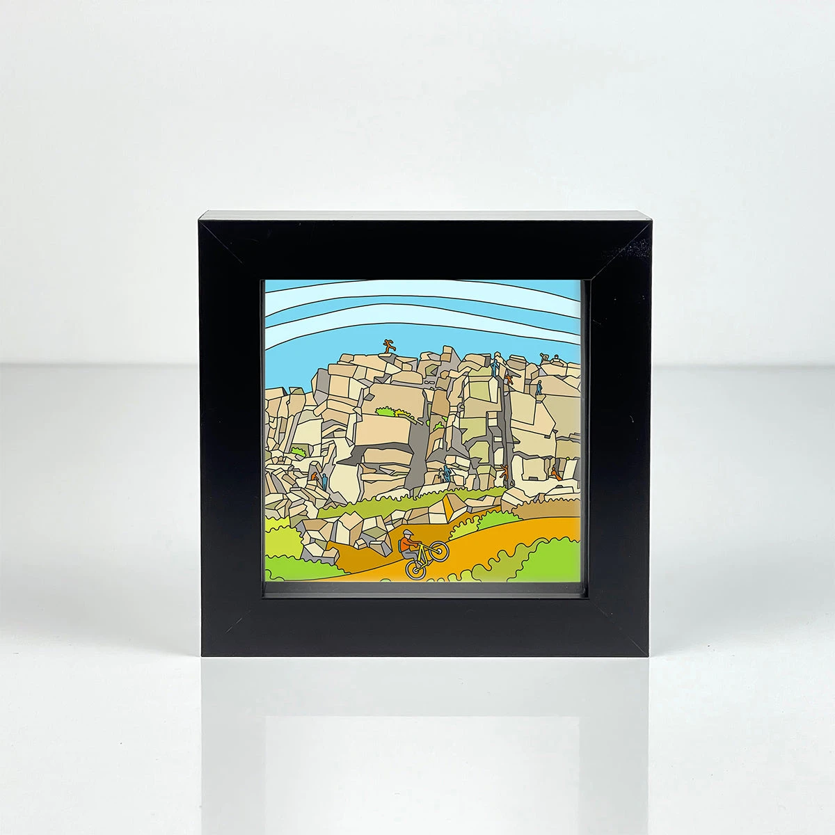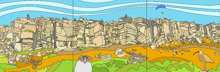 This pen drawing is the first of three works that combine to illustrate the activities, in this part mountain biking, climbing and running along Stanage.