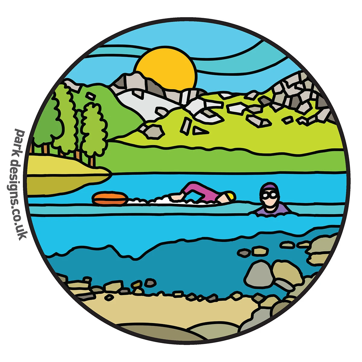 Pictured here is Si’s artistic take on a couple of wild swimmers in the tarn overlooking the Langdale Pikes in the Lake District. A brightly coloured float, some serious happiness and cold water endorphins are the principle feature of this idyllic scene. #lovingit